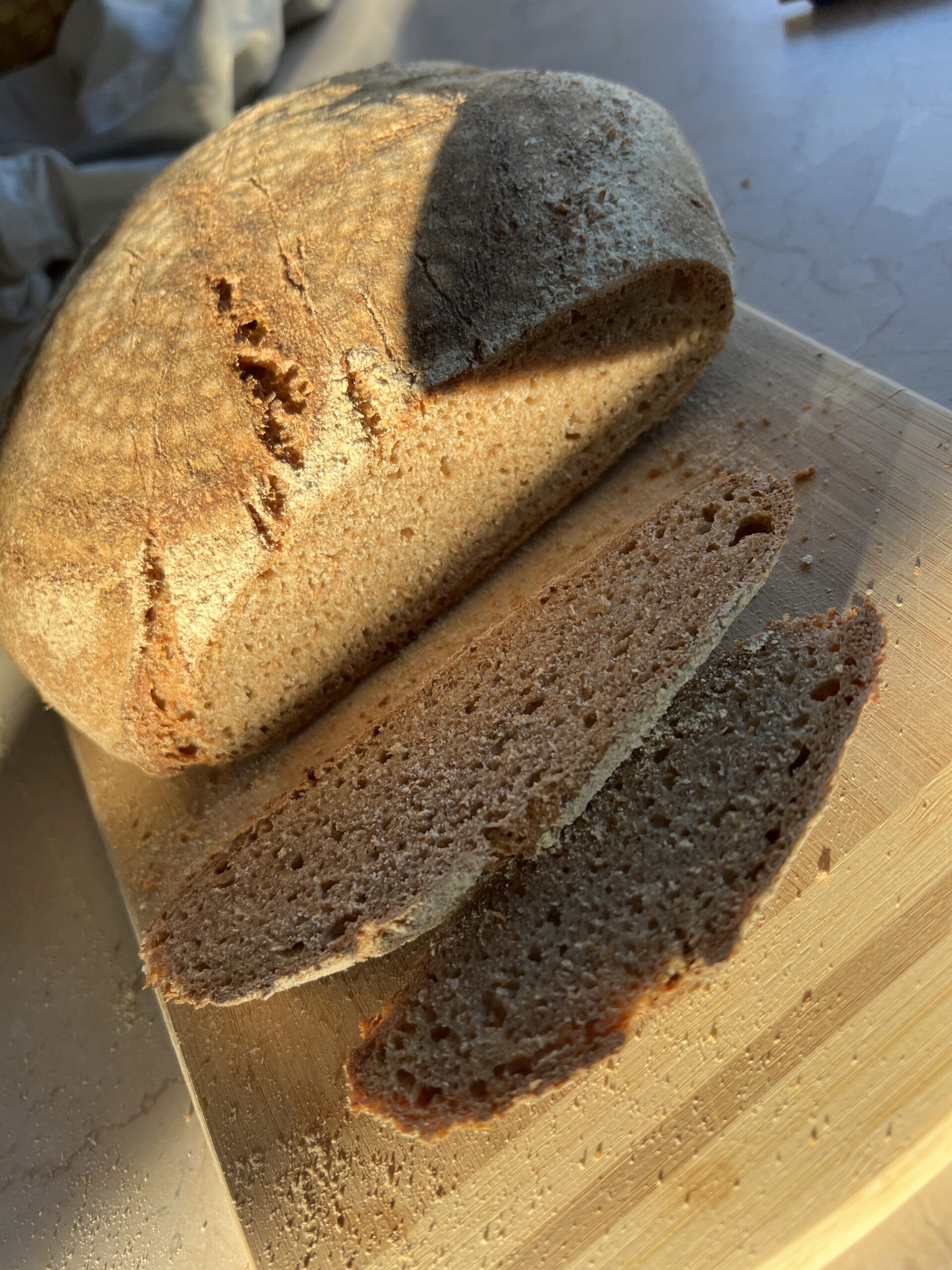Versuch macht klug Nach circa einem Dutzend Iterationen ist nun ein Sauerteig-Brot gelungen, das rundum gelungen ist: Farbe, Form, Geschmack, Festigkeit, Säuregrad. Dinkel mit viel Vollkorn