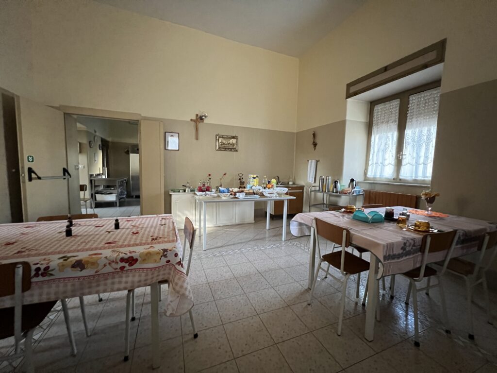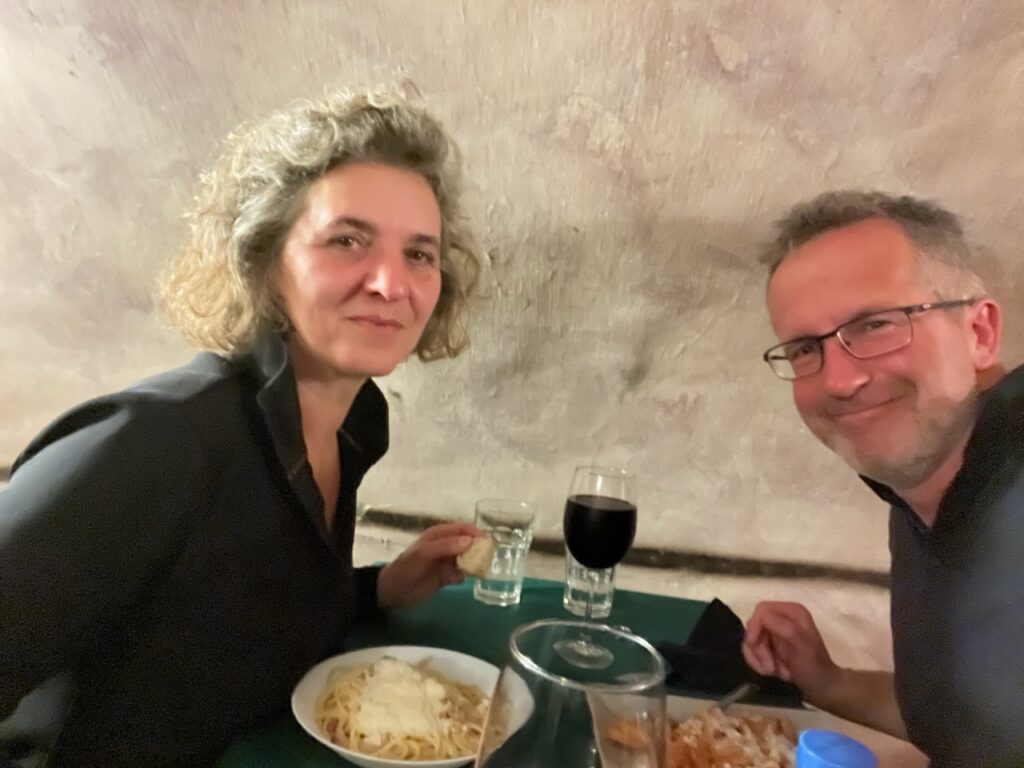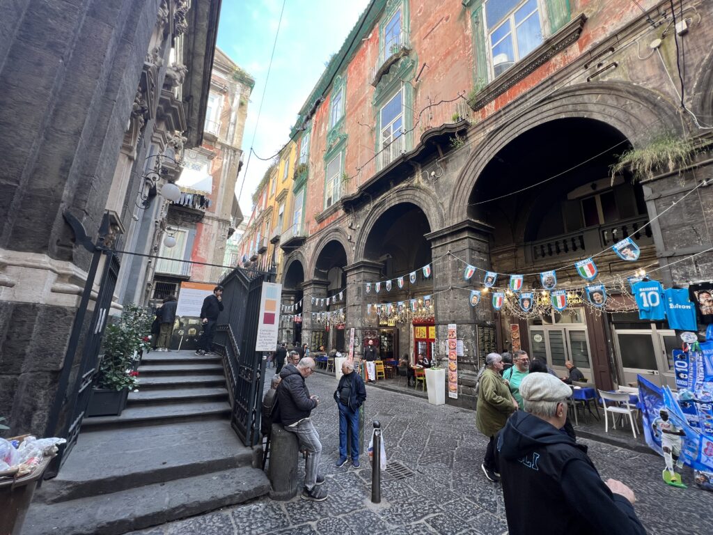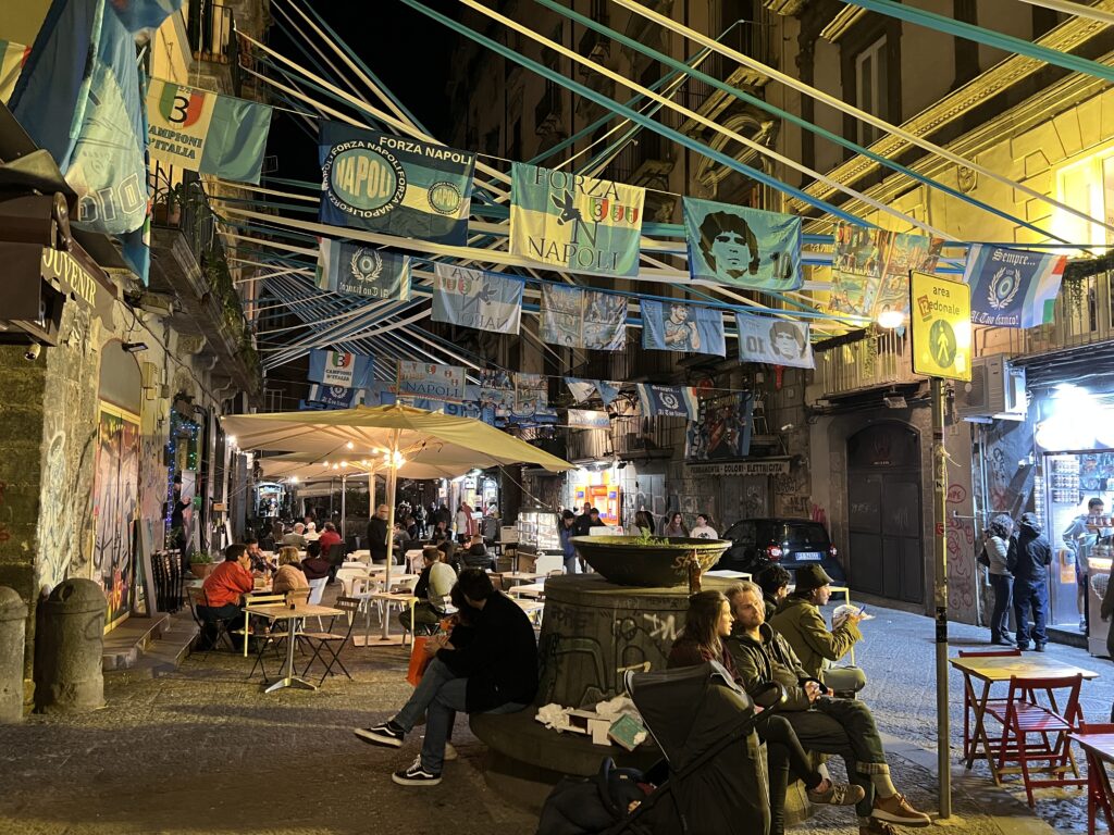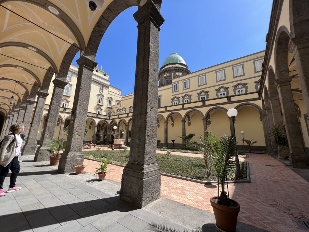 Wir wohnen im Kloster weiter außerhalb als gedacht, dafür wohl behütet bei den Schwestern. Abends sind wir noch mit dem Taxi ins Zentrum gefahren, um einen ersten Eindruck zu gewinnen: Napoli ist im Fußballfieber, morgen geht es gegen Mailand – jedes Haus, auch in der Vorstadt, ist blau weiß geschmückt.