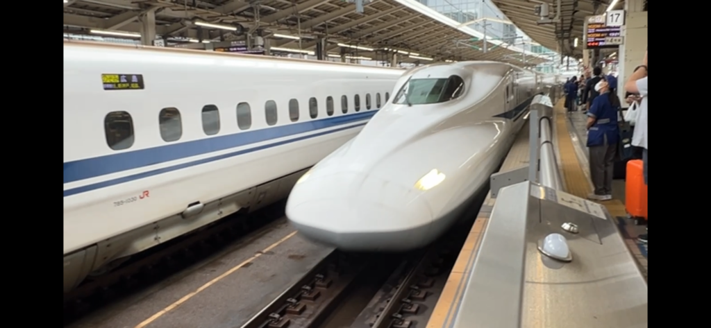 der Shinkansen Tokyo – Osaka fährt ca 20 Minuten vor Abfahrt ein. Nachdem alle ausgestiegen sind geht die Reinigungscrew rein. Jeder Wagen steht an einem definierten Platz, alle warten in einer Schlange bis sie reindürfen. In die meisten Wagen darf man nur mit reserviertem Sitzplatz rein. Große Beinfreiheit nach vorn und eine gute Liegefunktion, die Züge sind breiter als bei uns, in einer Reihe sind 5 Sitze.