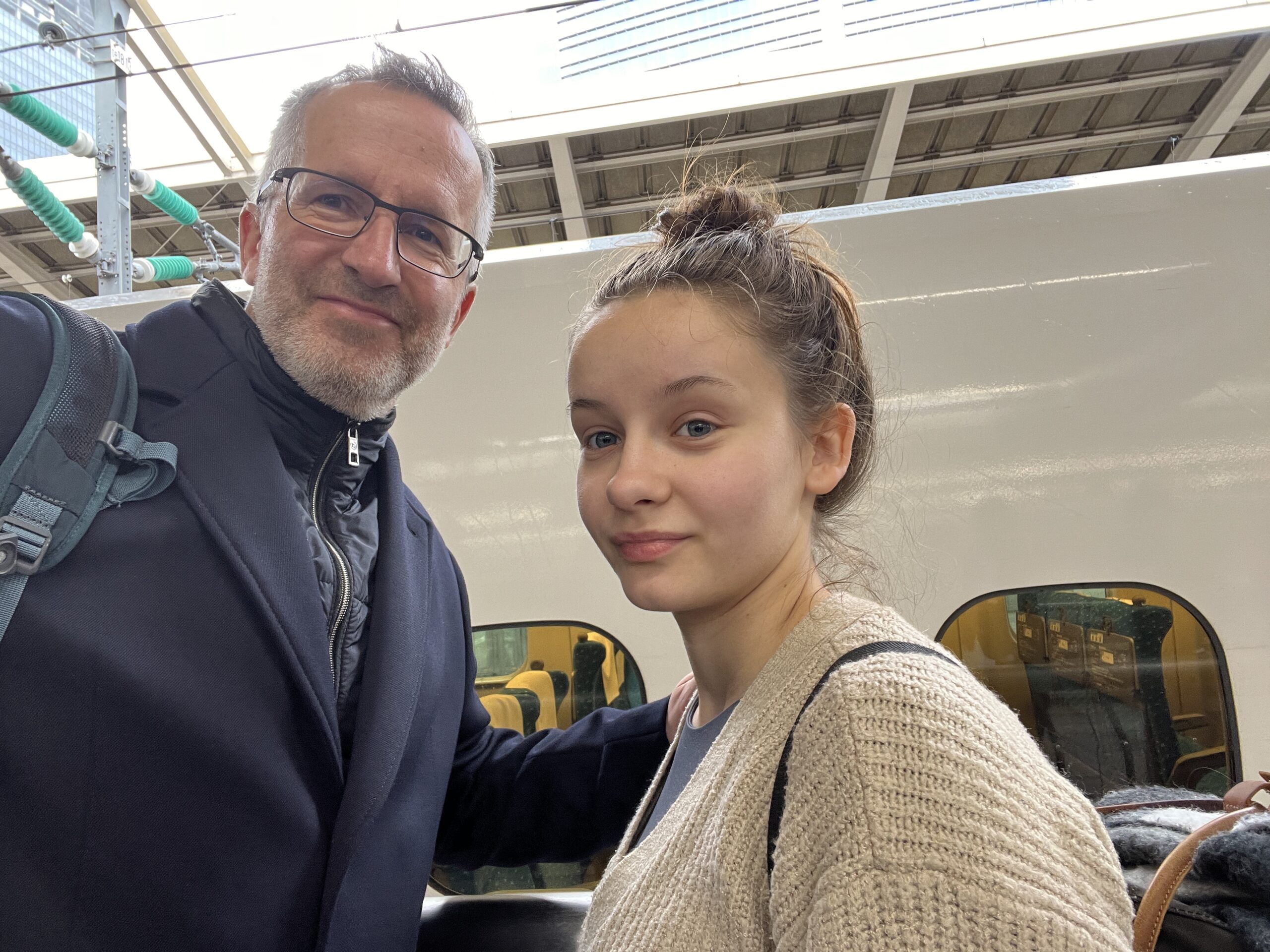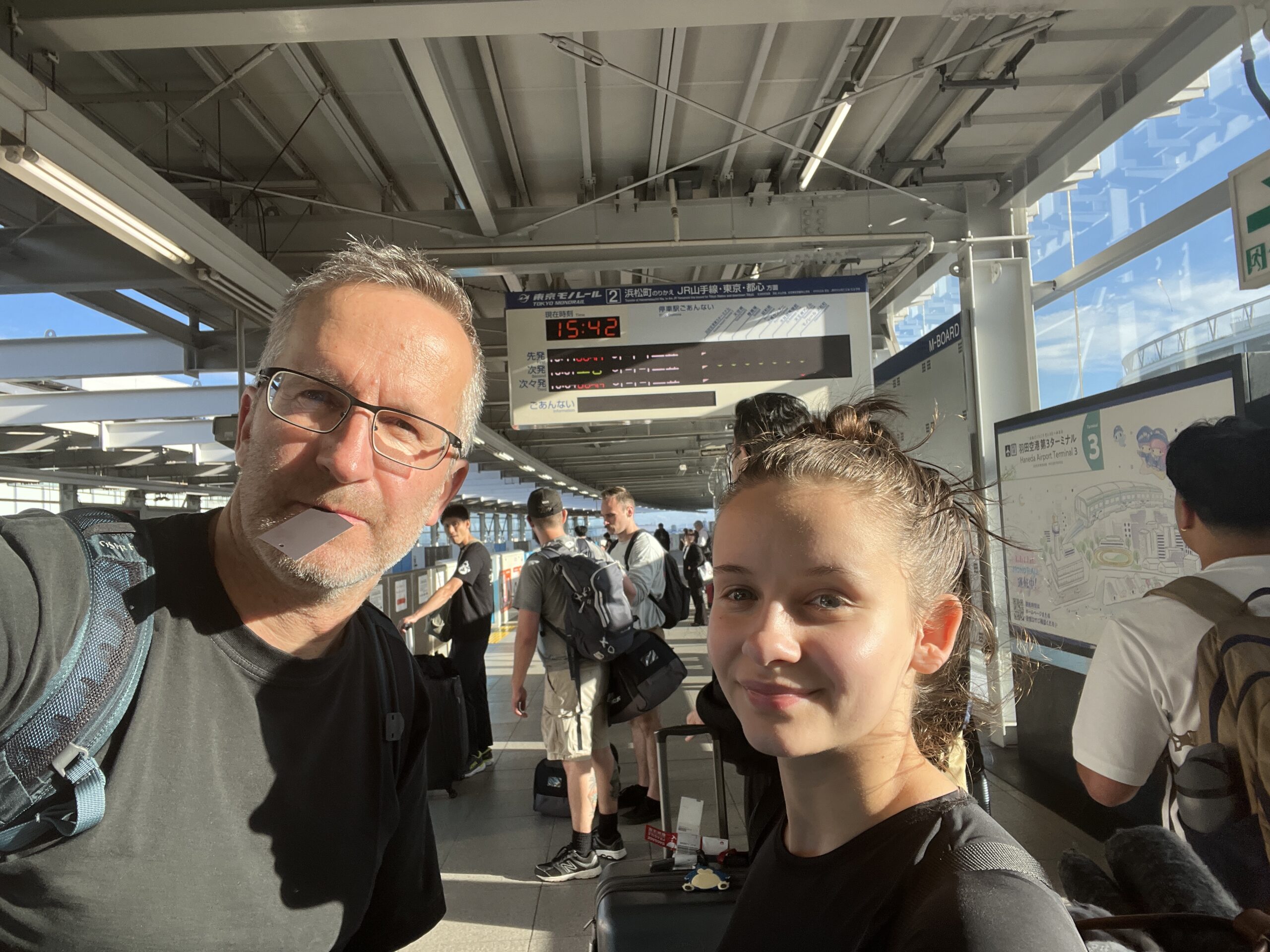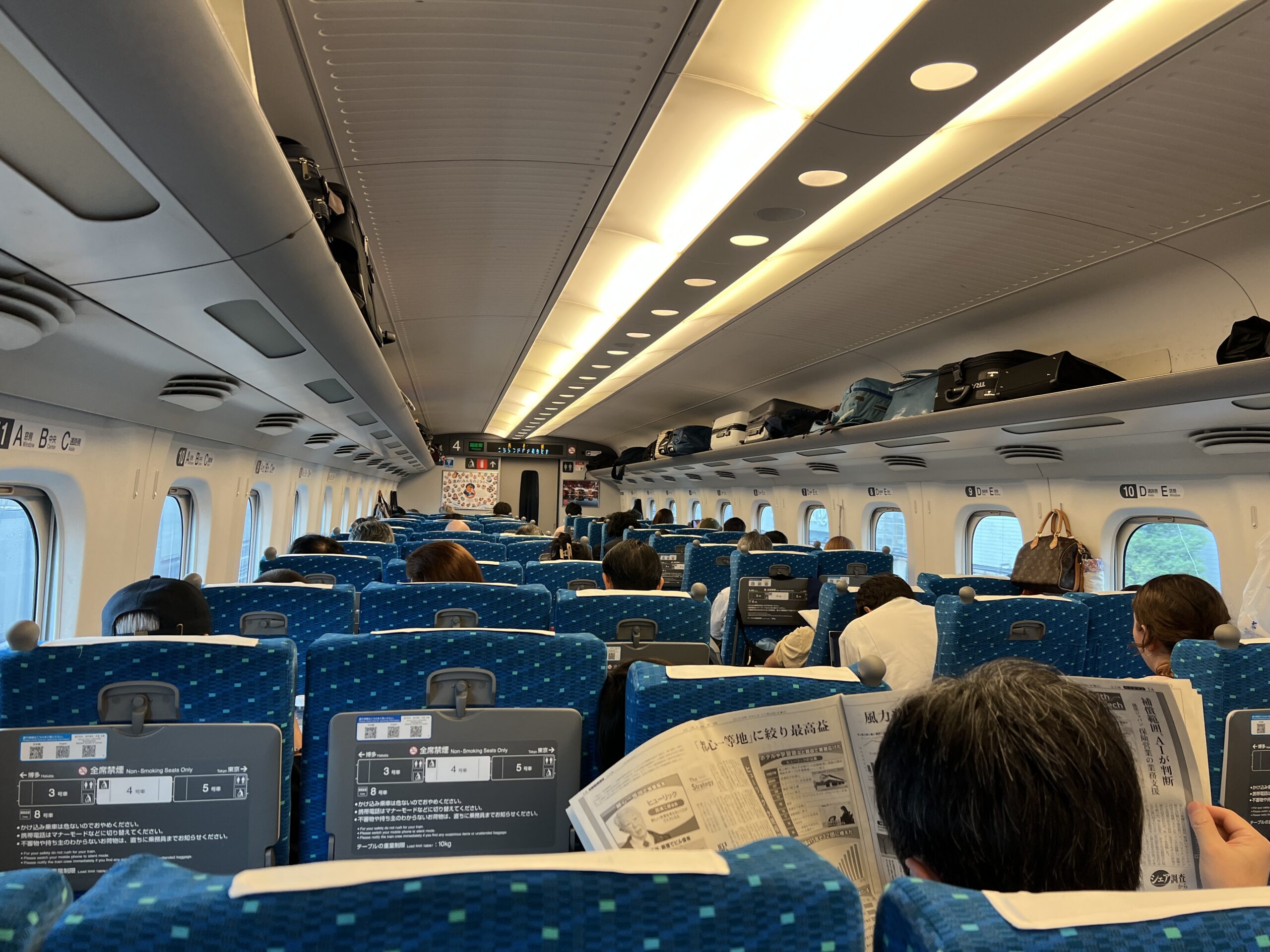 der Shinkansen Tokyo – Osaka fährt ca 20 Minuten vor Abfahrt ein. Nachdem alle ausgestiegen sind geht die Reinigungscrew rein. Jeder Wagen steht an einem definierten Platz, alle warten in einer Schlange bis sie reindürfen. In die meisten Wagen darf man nur mit reserviertem Sitzplatz rein. Große Beinfreiheit nach vorn und eine gute Liegefunktion, die Züge sind breiter als bei uns, in einer Reihe sind 5 Sitze.